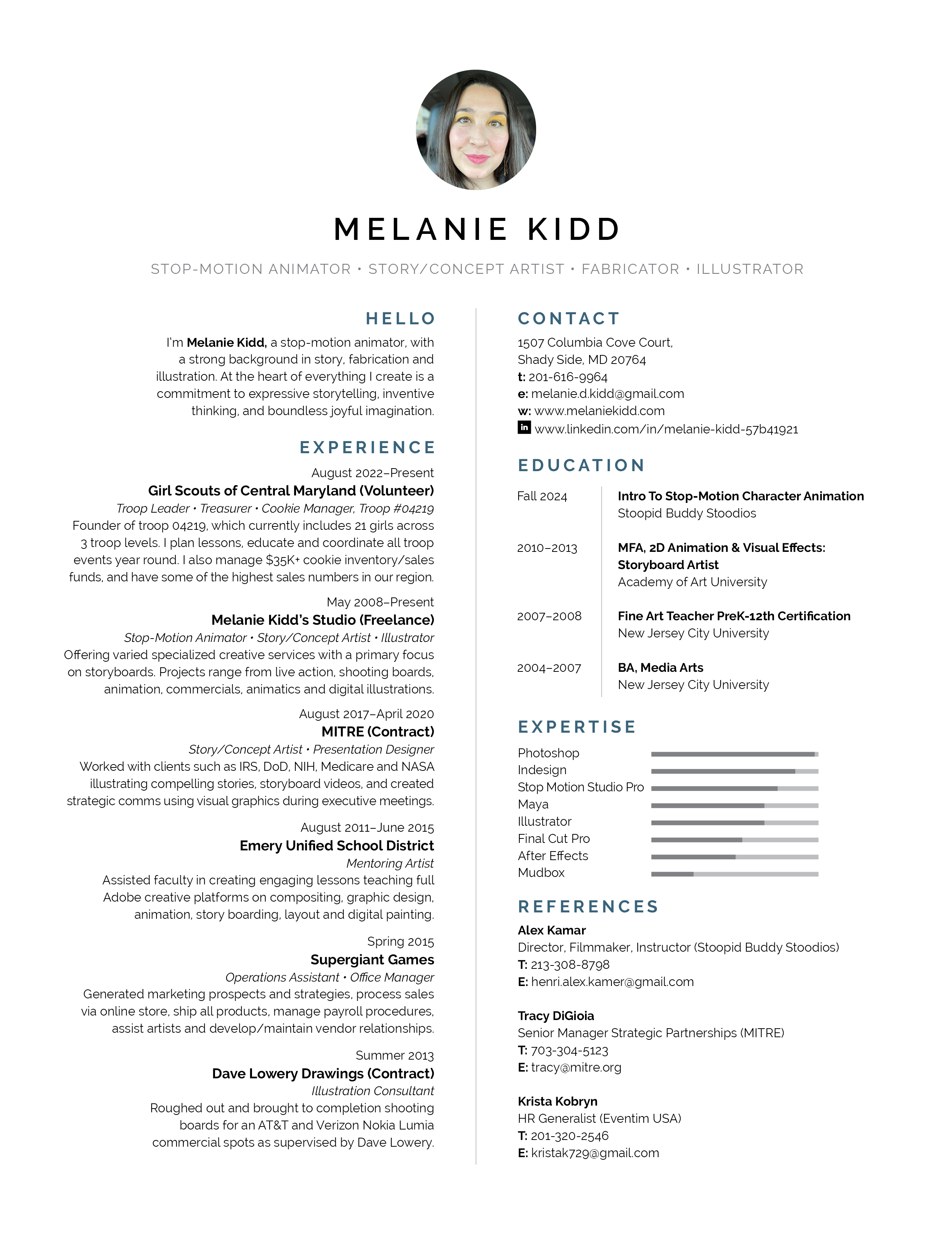 Resume Melanie Kidd Resume WebDownload Melanie Kidd LinkedIn Instagram Facebook Vimeo melanie.d.kidd@gmail.com201-616-9964© 2008-2025 Melanie Kidd All rights reserved.